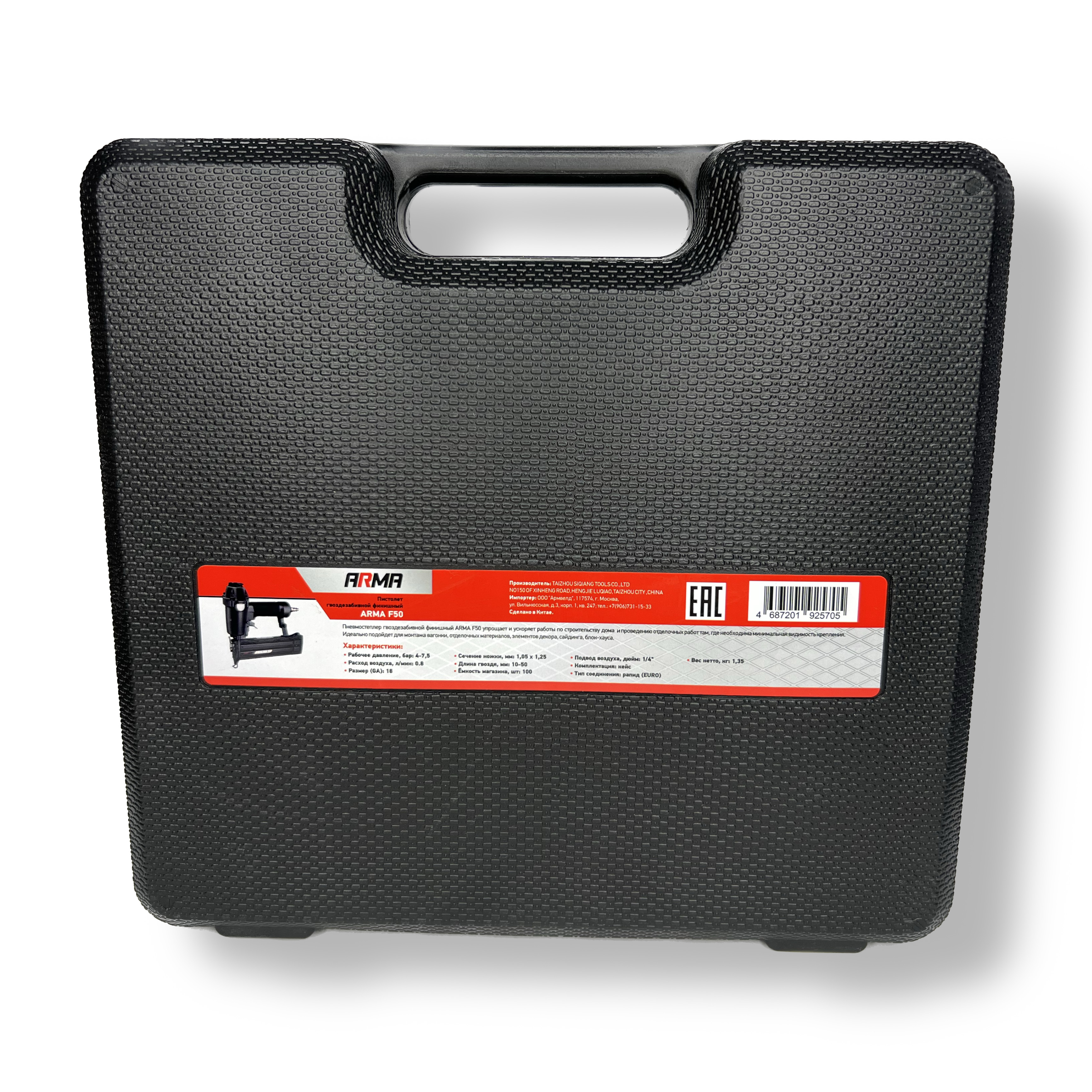 - Инструмент имеет прочный корпус из надежных высококачественных материалов. Благодаря этому гвоздезабивной пистолет ARMA F50 способен выдерживать длительную эксплуатацию без риска механических повреждений.
